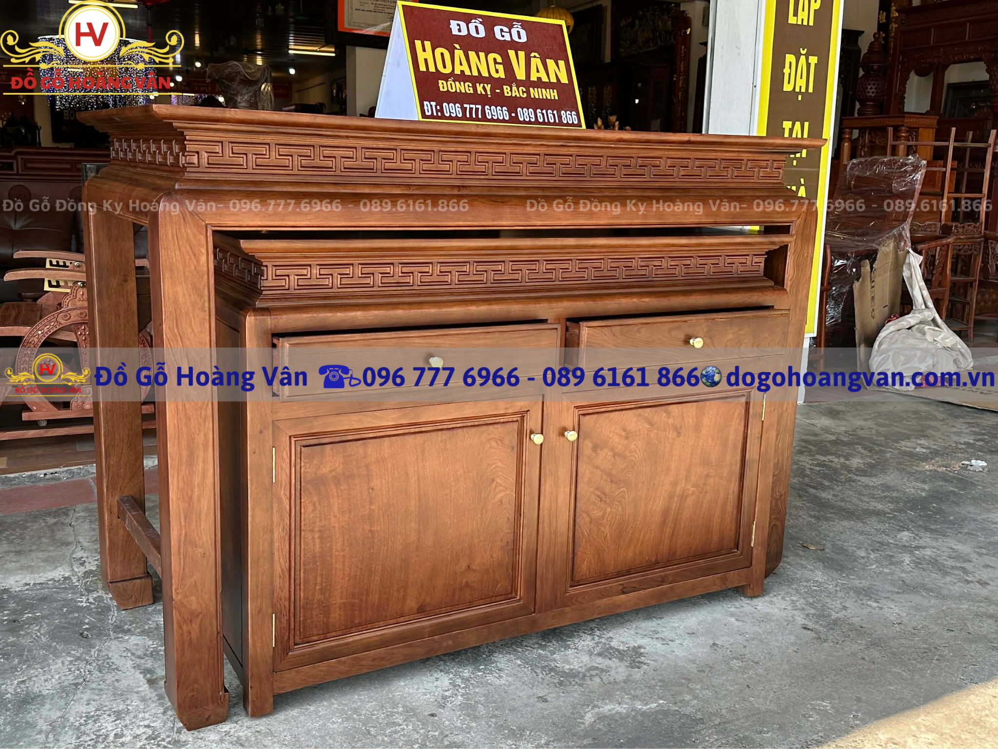 - Mẫu phòng thờ được thiết kế và sản xuất bởi Đồ Gỗ Hoàng Vân – Được gắn logo và nhãn hiệu bảo vệ chính hãng