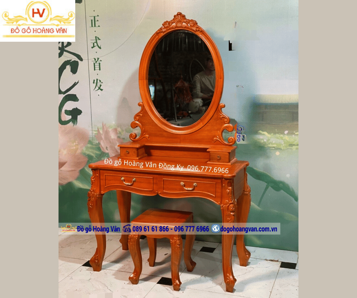 Đồ Gỗ HOÀNG VÂN chuyên sản xuất bàn trang điểm, bàn phấn gỗ tự nhiên như:gỗ hương, gỗ gụ , gỗ gõ , gỗ mun , cẩm... các loại theo yêu cầu. Là nhà xưởng sản xuất trực tiếp , nên chúng tôi luôn mang lại cho quý khách hàng những sản phẩm bàn trang điểm, bàn phấn đẹp nhất, chất lượng nhất, giá thành mềm nhất, kích thước và mẫu mã của tủ quần áo có thể thay đổi theo yêu cầu mà khách hàng đưa ra.