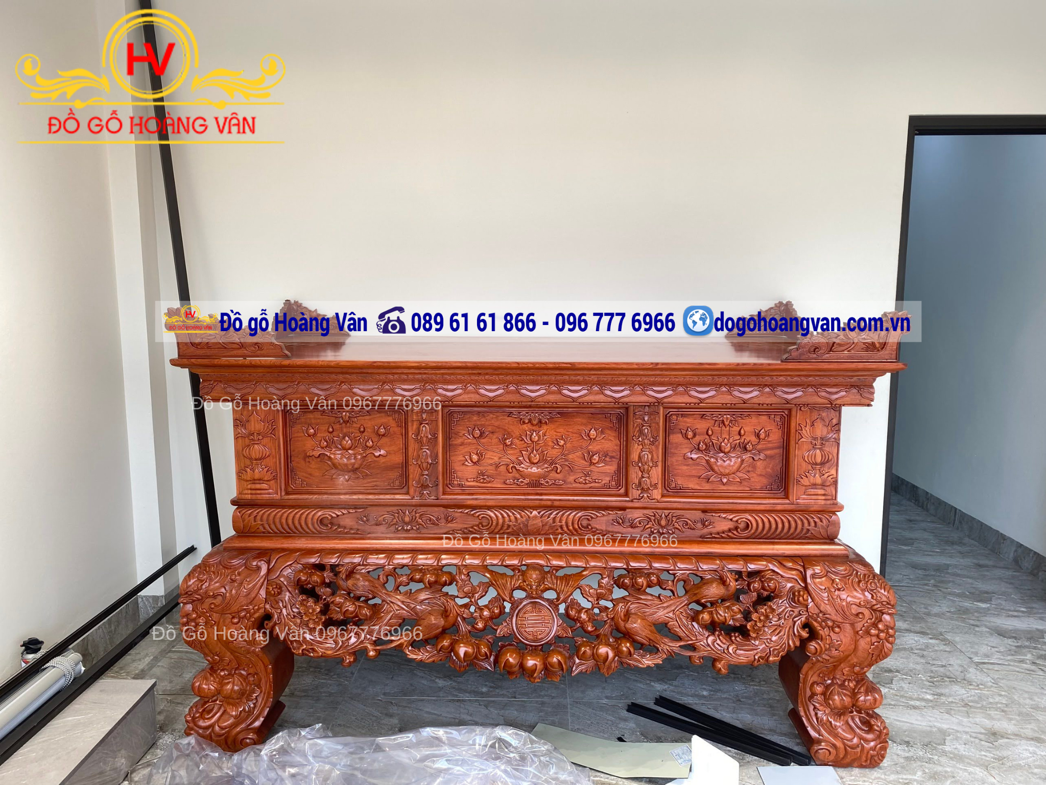 - Mẫu sập thờ được thiết kế và Sản xuất bởi Đồ Gỗ Hoàng Vân – Được gắn logo và nhãn hiệu bảo vệ hàng chính hãng